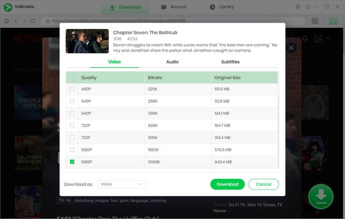 Select the video's thumbnail, and you'll access the video's details page or the playback page. Meanwhile, the gray download button in the lower right corner will change to green. VidiCable allows you to select specific video quality, audio track and subtitle track when you are trying to get videos from these 13 sites.